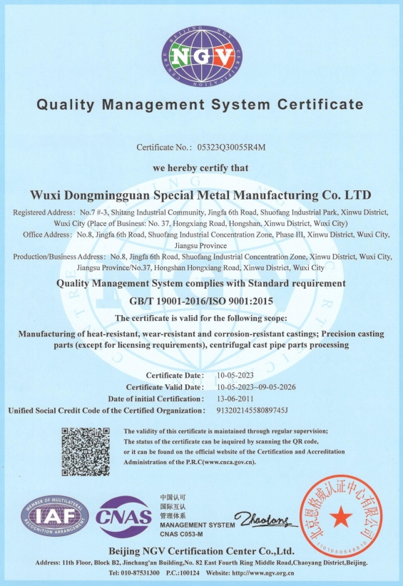 Wuxi Dongmingguan Special Metal Manufacturing Co., Ltd. Si trova sulla riva del bellissimo lago Taihu, con uno splendido scenario, un clima piacevole e un comodo trasporto. Si affida solo alla ferrovia ad alta velocità di Shanghai Nanchino, all'autostrada Shanghai Nanchino e all'aeroporto di Shuofang nel Jiangsu meridionale, a soli due chilometri di distanza, con una capacità di colata annua di 5.000 tonnellate.